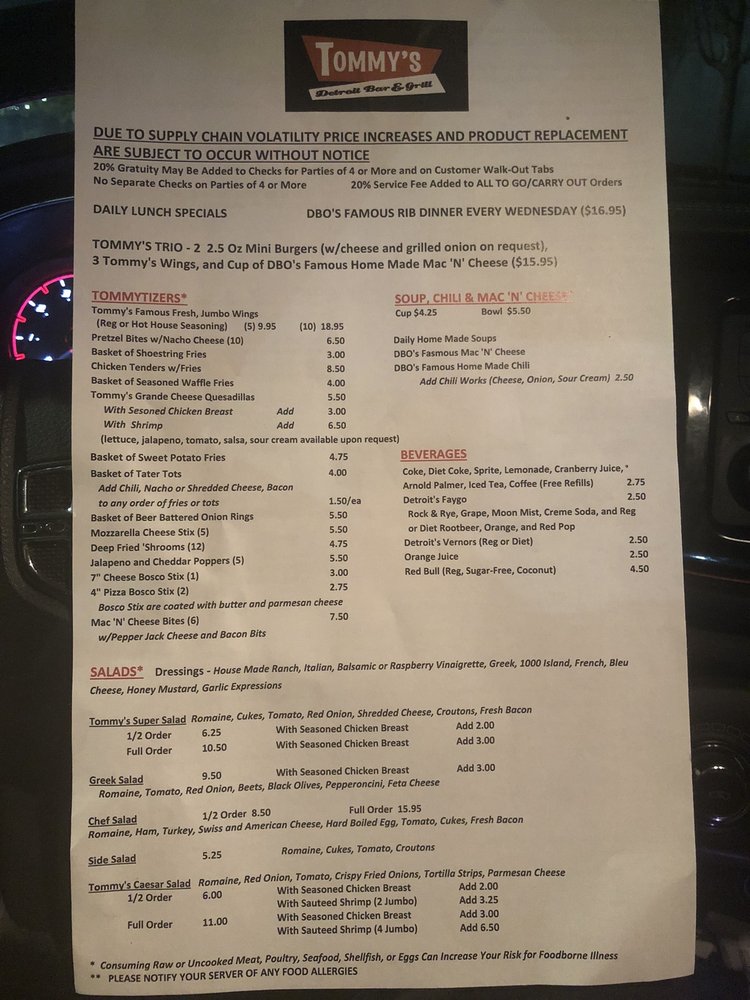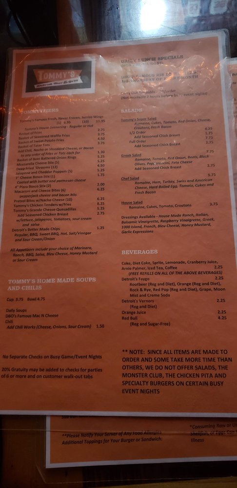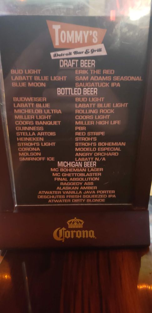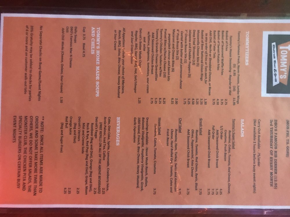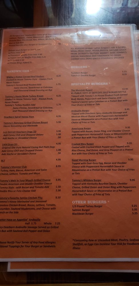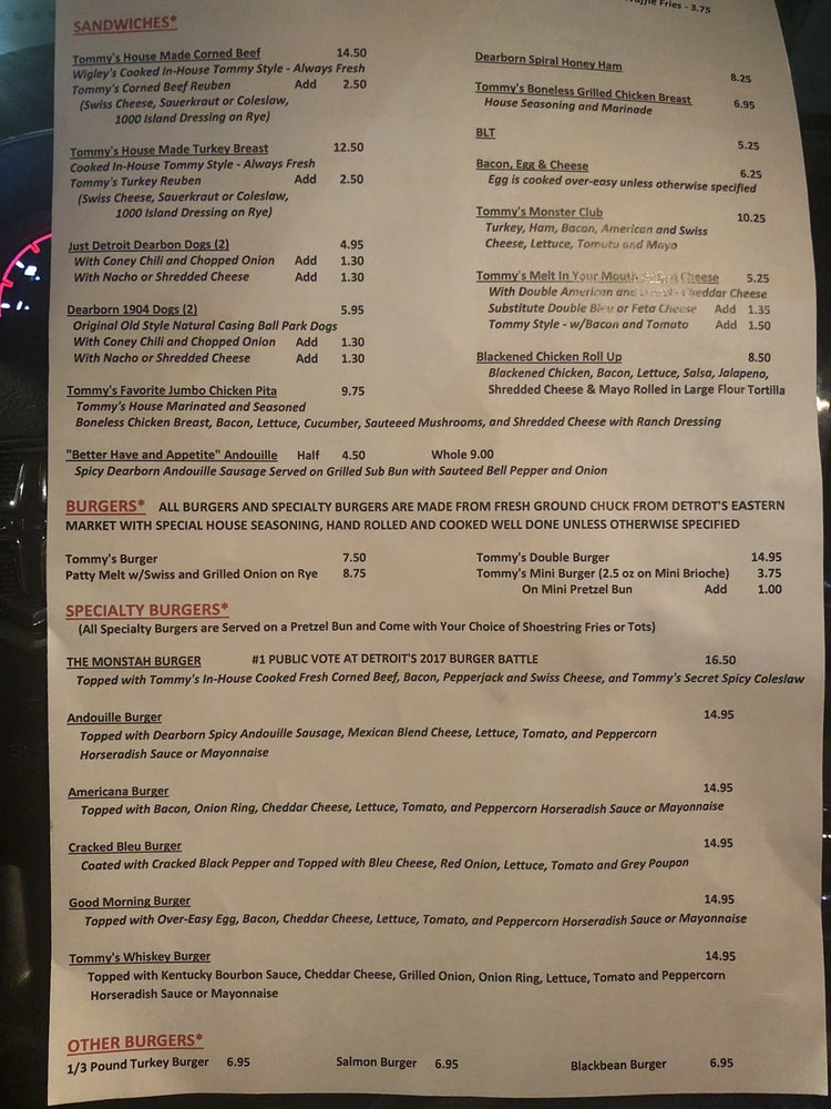 Tommy’s Detroit Bar & Grill offers a casual American bar experience with a variety of menu options. From Tommytizers like Detroit's Better Made Chips and Macaroni & Cheese Bites, to homemade soups and salads, there's something for everyone to enjoy. The Chef Salad and Tommy's Super Salad are fresh and satisfying choices. The restaurant also has many vegetarian options and is kid-friendly, making it a great spot for families. With amenities like outdoor seating, a full bar, and pool table, Tommy’s is a lively place to gather with friends. The menu features a range of flavors from BBQ to Bleu Cheese to suit every palate. Whether you're looking for a quick lunch or a Friday night out, Tommy’s Detroit Bar & Grill is a versatile and welcoming option in the heart of Detroit.
